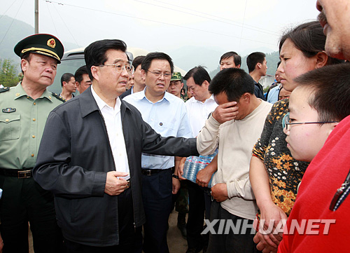 5月16日下午,中共中央总书记、国家主席、中央军委主席胡锦涛在受地震灾害严重的四川省绵阳市北川县擂鼓镇胜利村看望受灾群众。