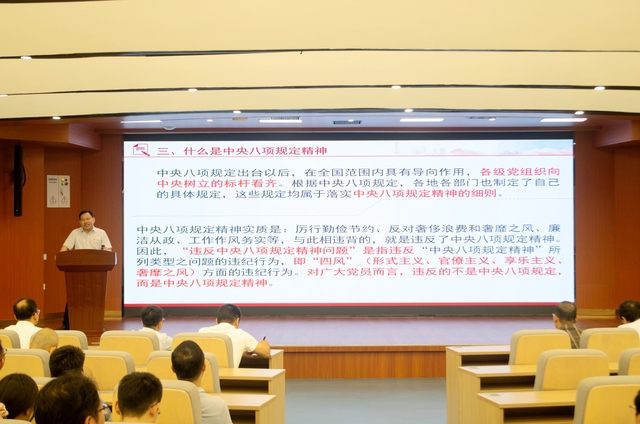 为进一步加强新时代党的作风建设,推动全面从严治党在基层党组织落地生根,6月12日下午,学院党委副书记文爱民在明德楼学术报告厅就深入贯彻中央八项规定精神讲授专题党课,汽车工程学院党总支全体党员、马克思主义学院党总支全体党员、基础教学部(国合办)党总支全体党员参加学习了此次党课。